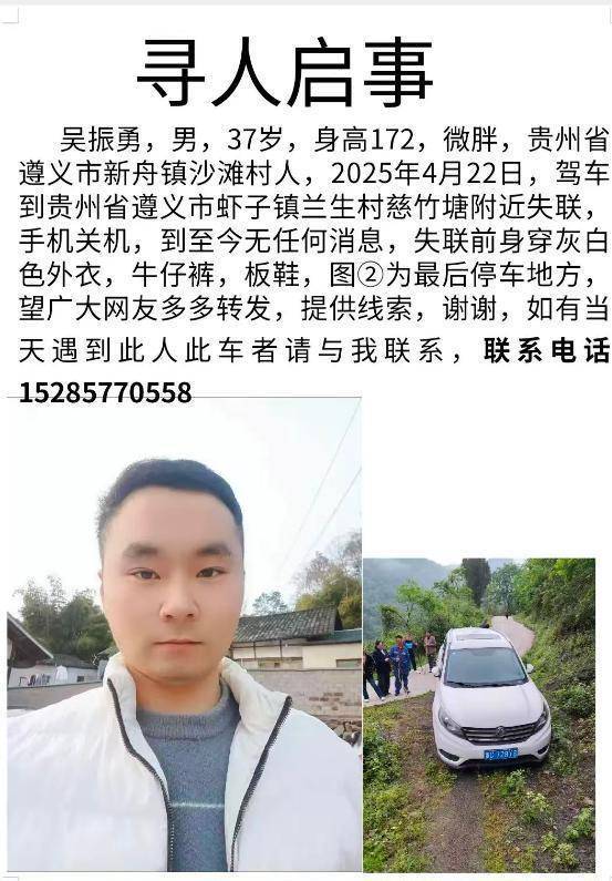 家属3月22日发布的寻人启事显示:吴振勇,男,37岁,身高172厘米,体型微胖,系遵义市新州镇沙滩村人。2025年4月22日,其驾车到遵义市虾子镇兰生村慈竹塘附近失联,手机关机,至今没有任何消息,失联前身穿灰白色外衣、牛仔裤、板鞋,希望广大网友提供线索。