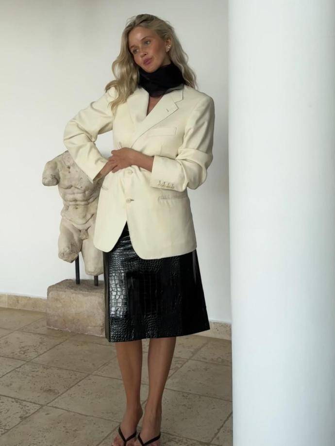 她对低饱和色调的把控堪称教科书级,每一套造型都在简约中藏着巧思。米白色廓形西装搭配黑色鳄鱼纹半裙,简约的白与黑碰撞出利落质感,黑色细带凉鞋中和了半裙的厚重,简约造型中又透着精致细节;长款卡其色风衣内搭白色上衣与黑色裤子,颈间搭配米白色流苏围巾,柔和的卡其与米白相融,宽松的风衣版型兼顾舒适,简约色调中又因围巾的层次感而更具韵味,是日常通勤可直接复刻的极简范本。